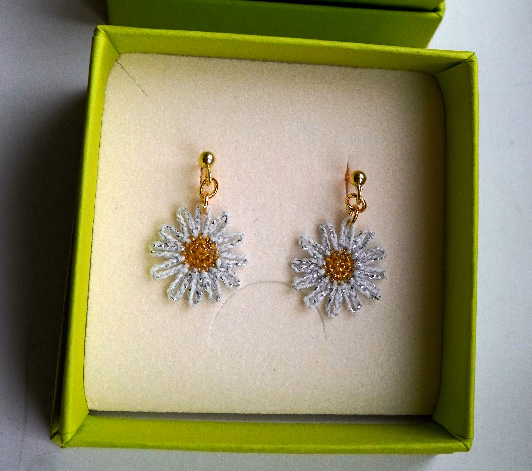 Glitrende, hvite prestekrager heklet med gul og hvit tråd og glittertråd. Blomsten måler ca. 1,8 cm. Ørestift i forgylt sølv(925).